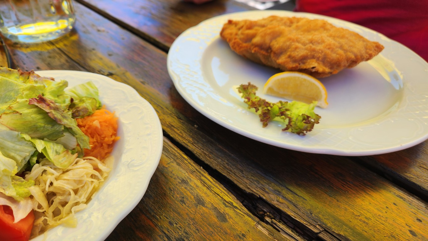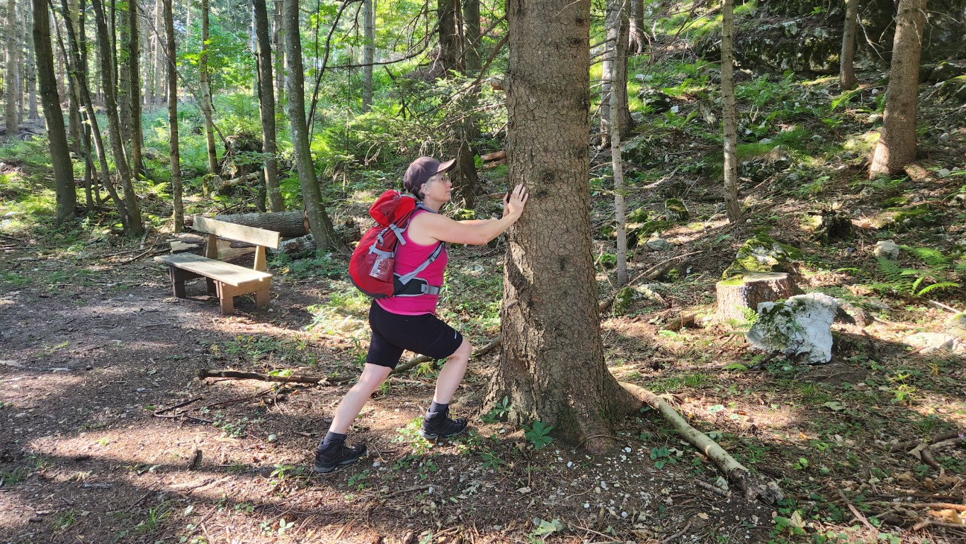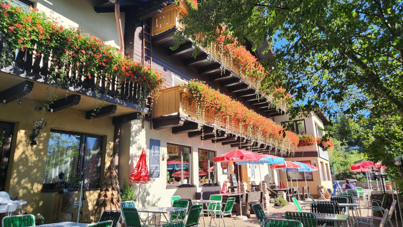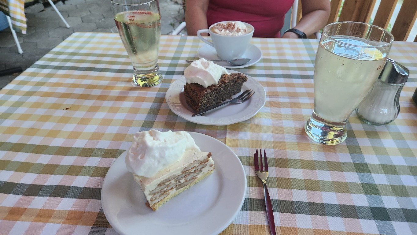 Es ging los mit Frühstück bei herrlichem Wetter. Sabine versuchte noch einen Baum zu verschieben, der sich ohne Erlaubnis von der Truppe entfernte. Bei ihrer Kraft ist ihr das mit Sicherheit gelungen. Durch den idyllischen Wald, der ausreichend Schatten spendete, ging es ~45min zum Gasthof Postl. Ich bin immer wieder erstaunt, wieviel ein Sommerspritzer kosten kann. Es ging weiter zum Sykwalk-Cafe, das leider geschlossen hatte. So genossen wir die Aussichtung sahern den wagemutigen Paragleitern zu. Genug gesehen wanderten wir weiter über die Lange Wiese, am südwestlichen Fuß des Liederlichsbergs hinauf zur Kohlmais, dem dort ansessigen Waldeggerhaus. Speis und Trank wie immer ein wahrer Genuss bei lustiger Gesellschaft. Ein Hoch dem Waldeggerhaus! Natürlich darf die Nachspeise nicht fehlen. Ich sollte ein Stück holen, hmmm … habs wohl falsch verstanden und brachte jedem eines. 😁