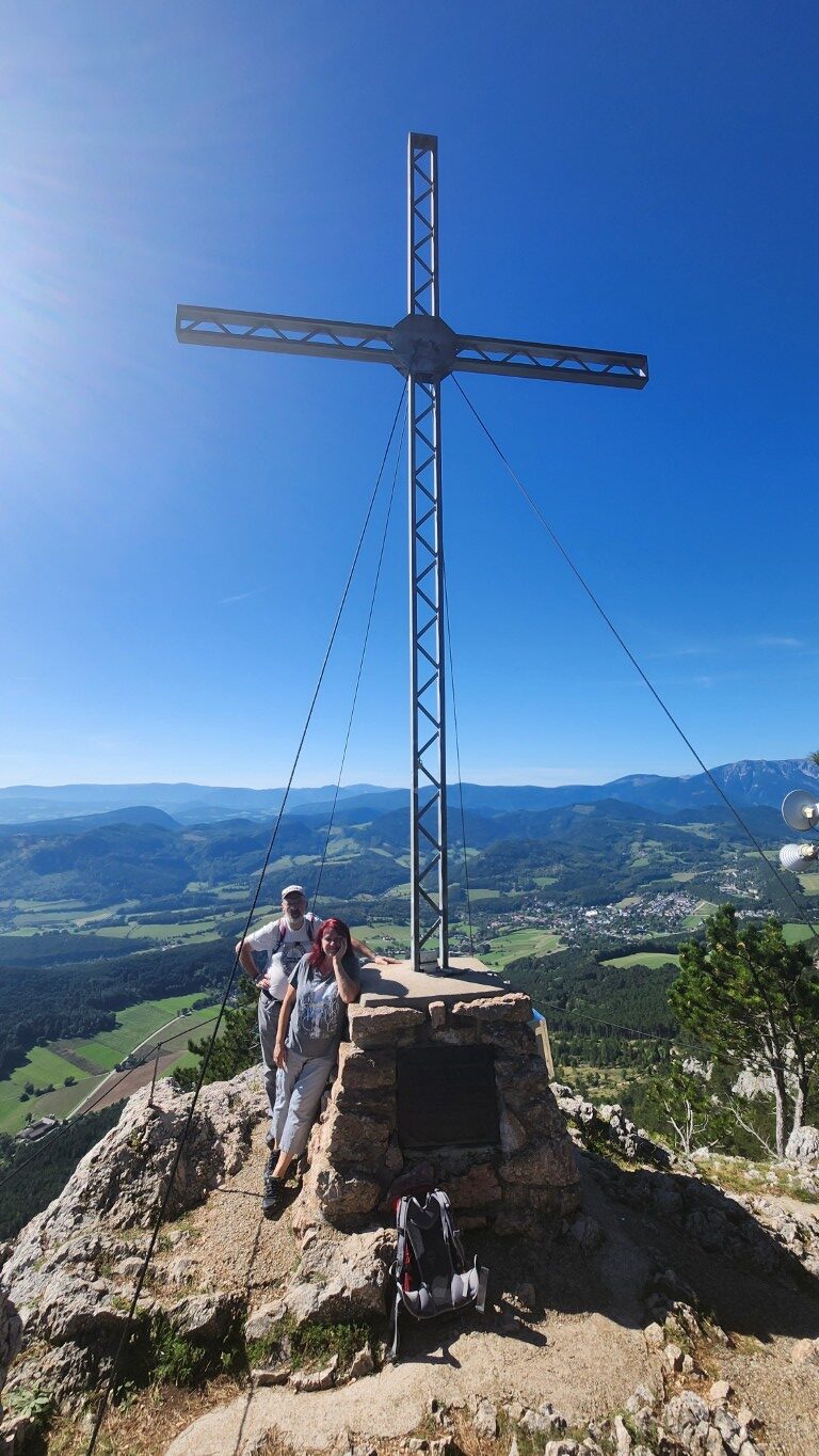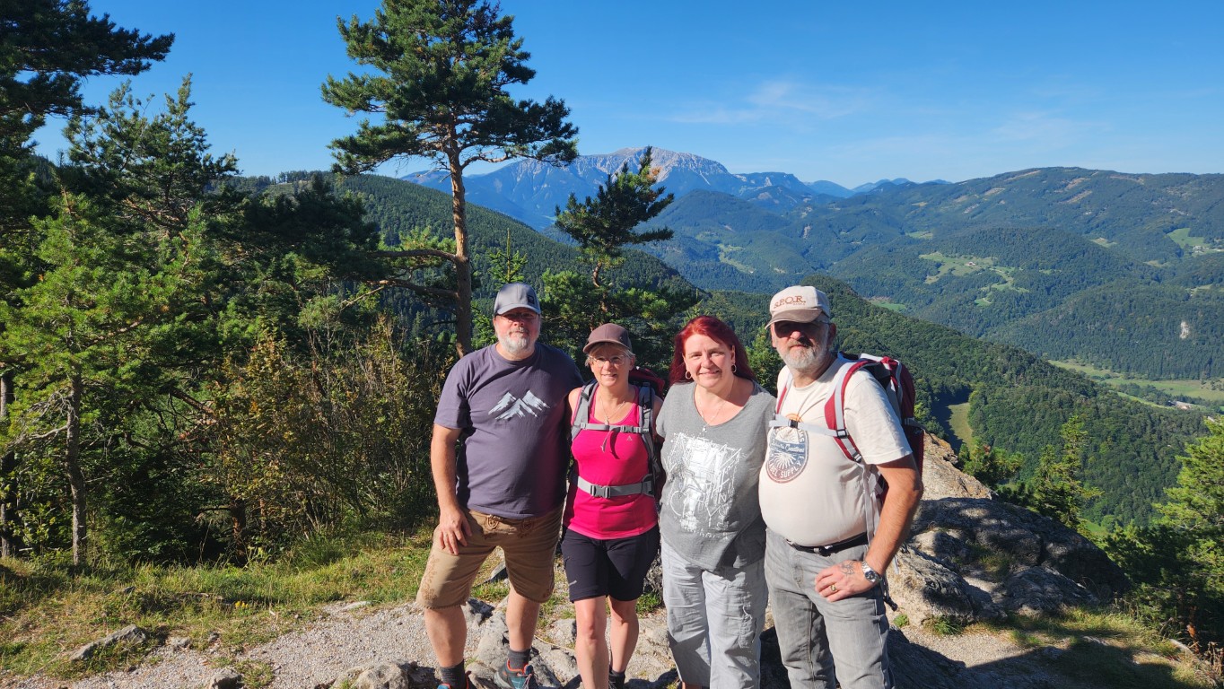 Sabine und ich gingen nach einem gschmackigen Frühstück von der Rohrbacherhütte los, um bei der Kleinen Kanzel auf unsere Freund zu warten. Dann gings aber auch gleich los. Wir marschierten durchs Wanddörfl bis zur Willhelm Eichert Hütte, wo wir zuerst beim Wildenauer Gedenkkreuz posierten und die Aussicht genossen. Wir stärkten uns und marschierten zurück zur Kleinen Kanzel. Dann gings per auto zum Luf auf eine warme Mahlzeit. Schön wars 😊